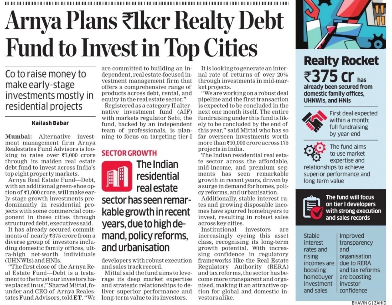 Arnya Realestates to raise Rs 1,000-cr debt fund to invest in top 8 realty markets